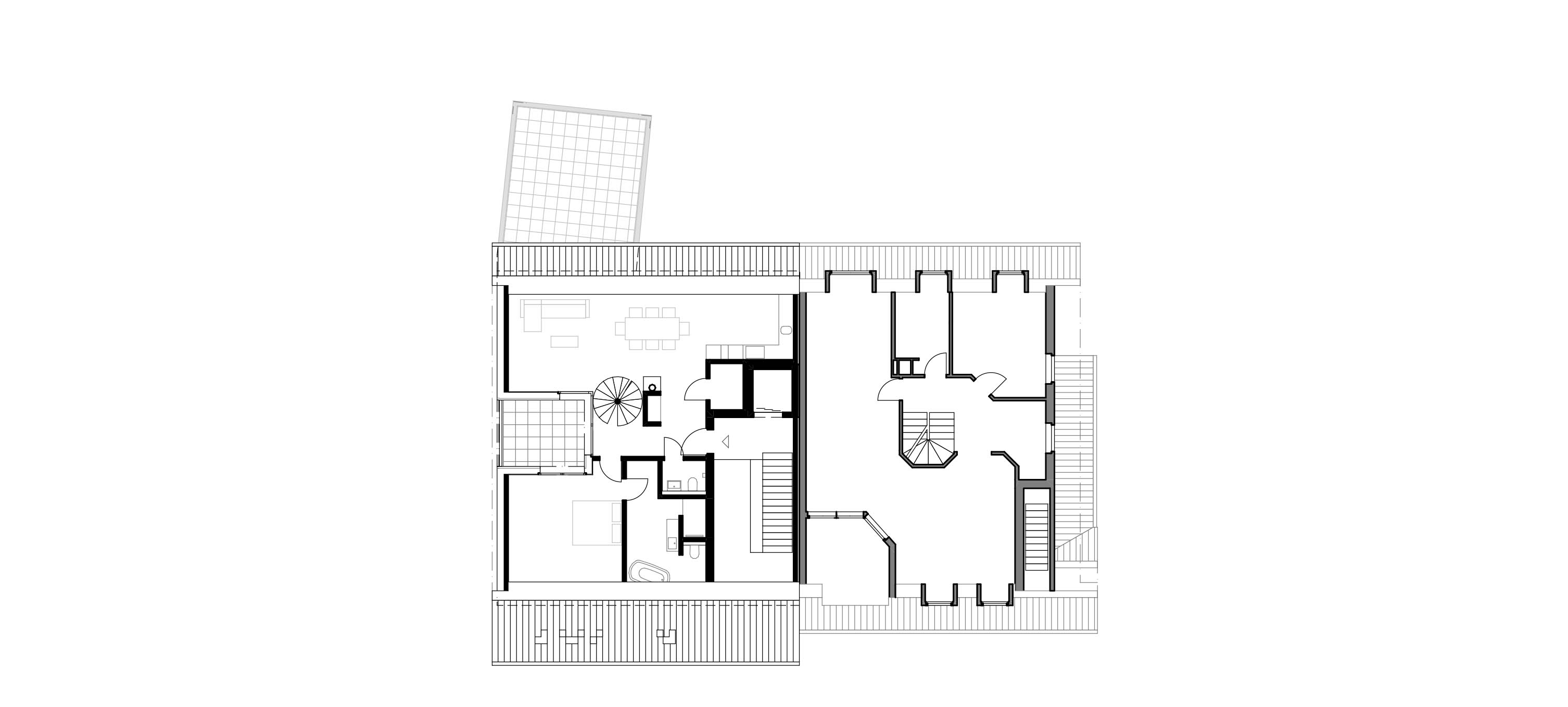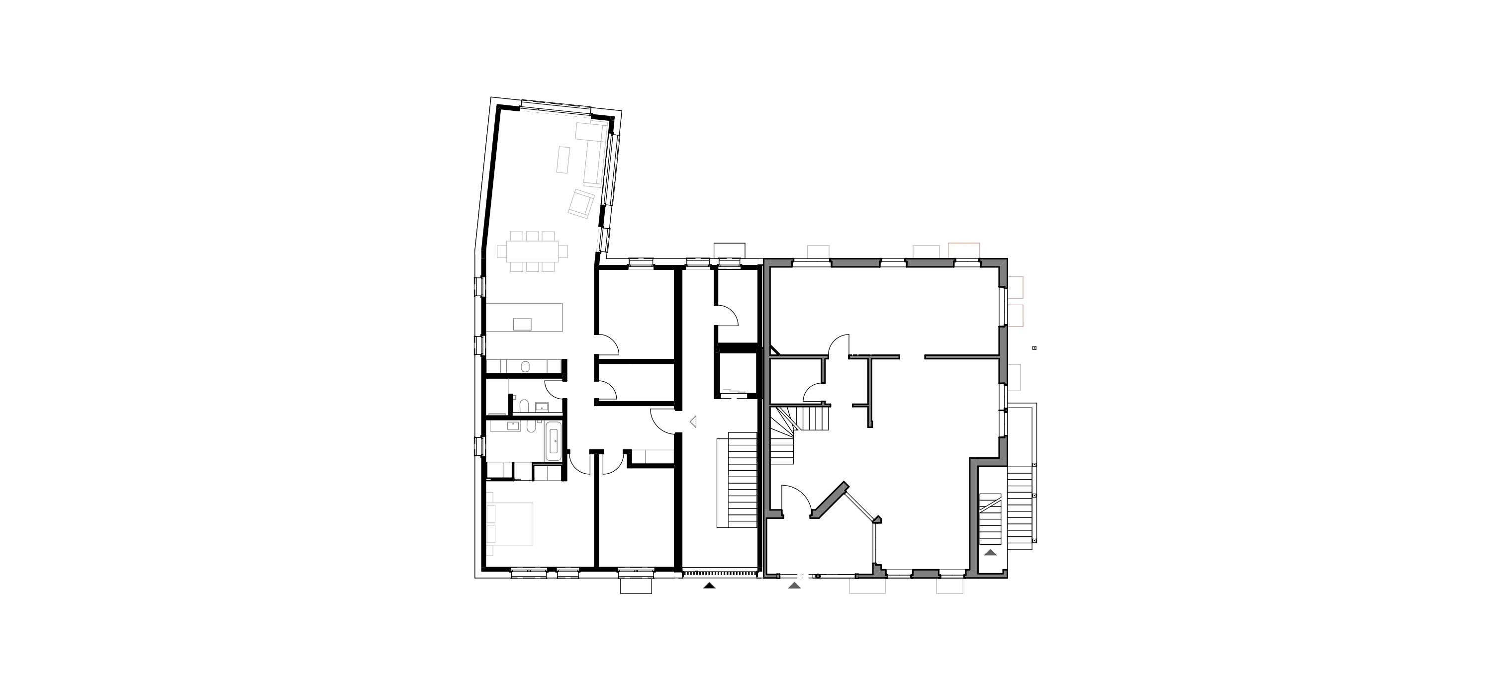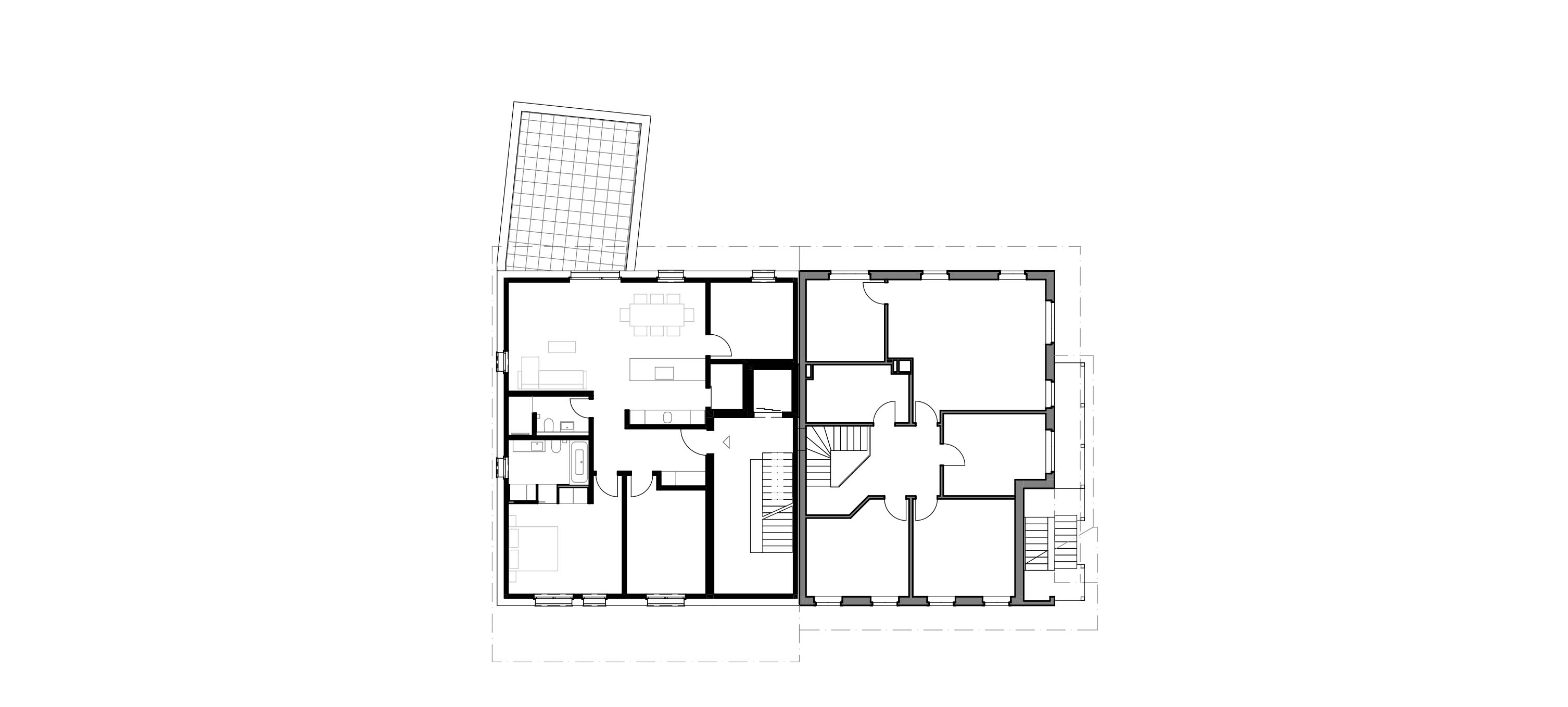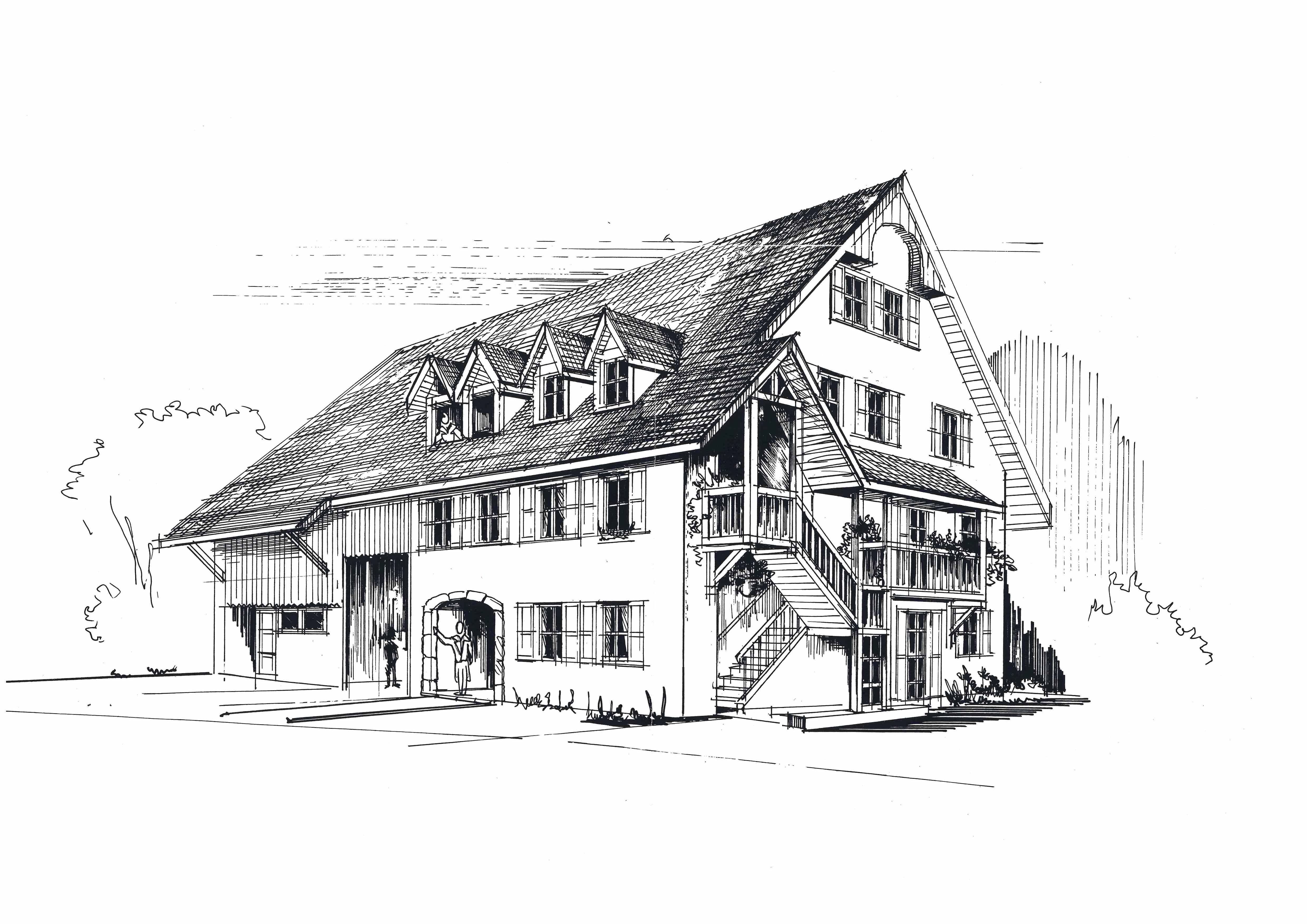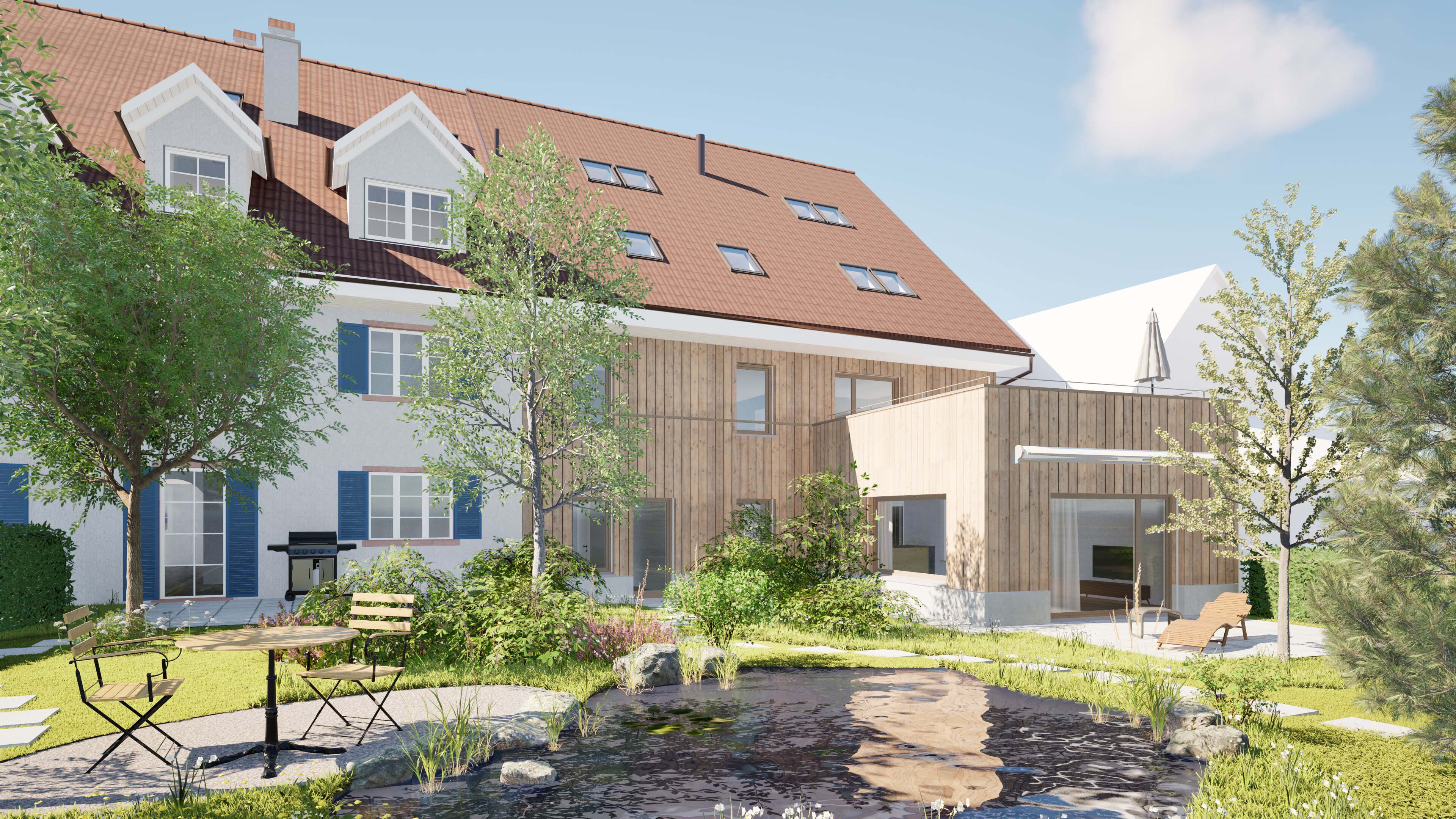 Der neue Baukörper übernimmt die bestehende Linienführung, gleicher Grenzabstand, eine vergleichbare Volumetrie und ein durchlaufendes Satteldach, das den Neubau harmonisch mit dem Wohnhaus verbindet. Während das Wohnhaus in seiner Substanz erhalten bleibt, entstehen im neu aufgebauten Ökonomieteil drei grosszügige Wohneinheiten, die moderne Wohnqualität mit ortsbaulicher Einbindung verbinden.
